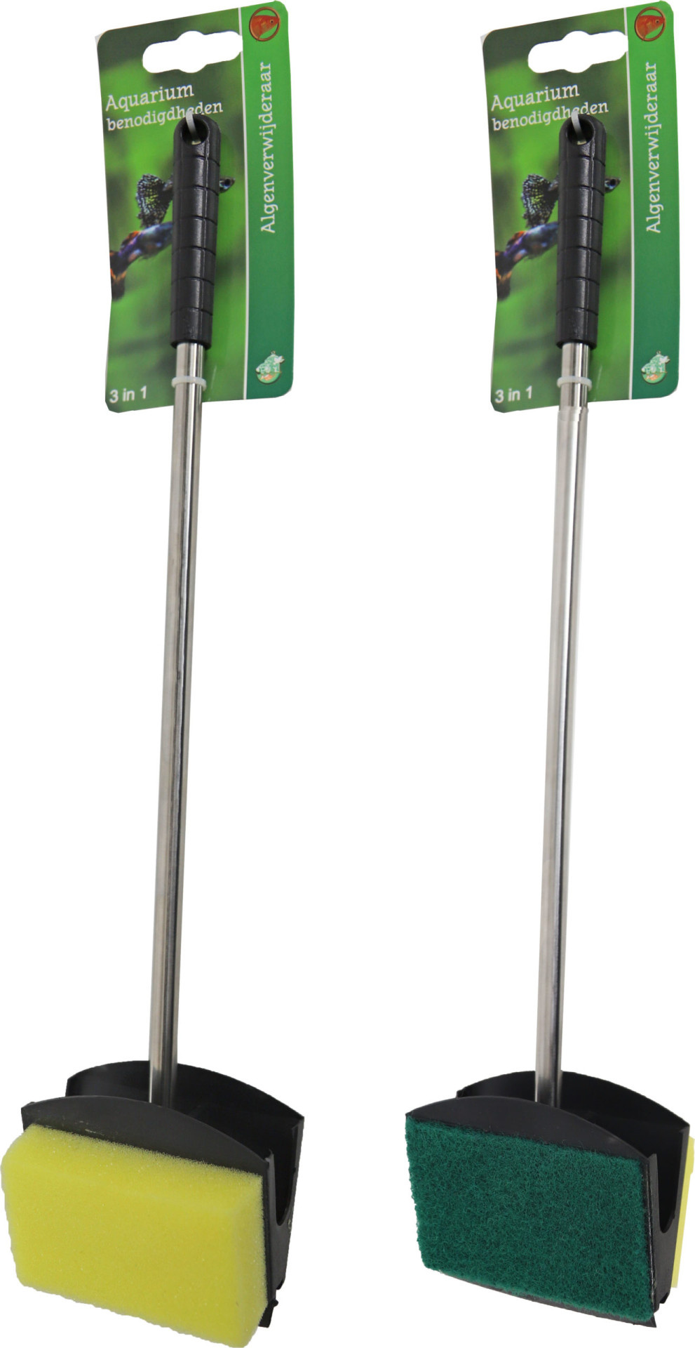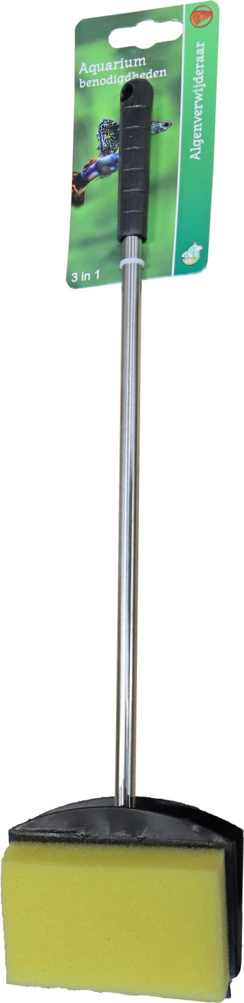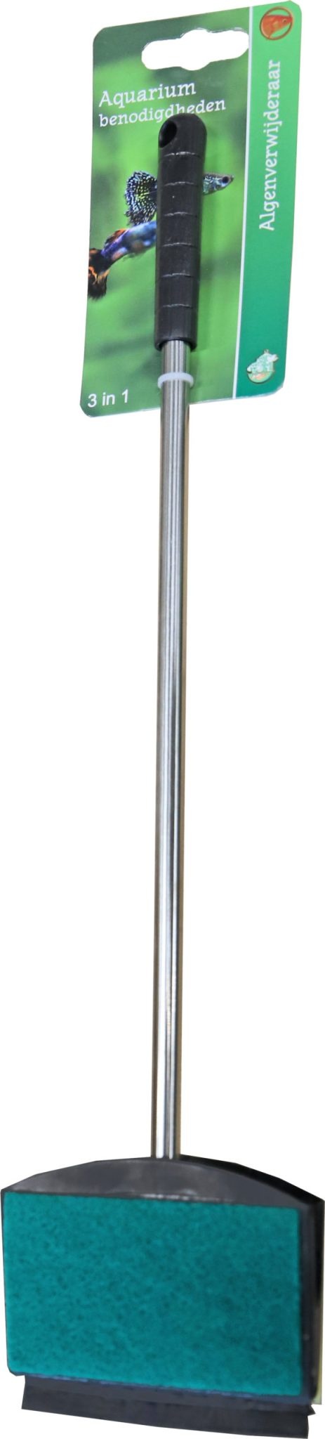 Algenverwijderaar 3 in 1 met 40 cm steel voor het schoonmaken van de aquarium ruiten. Deze algensteker heeft een grove spons, een fijne spons en een krabber die in twee verschillende richtingen kan worden geplaatst.