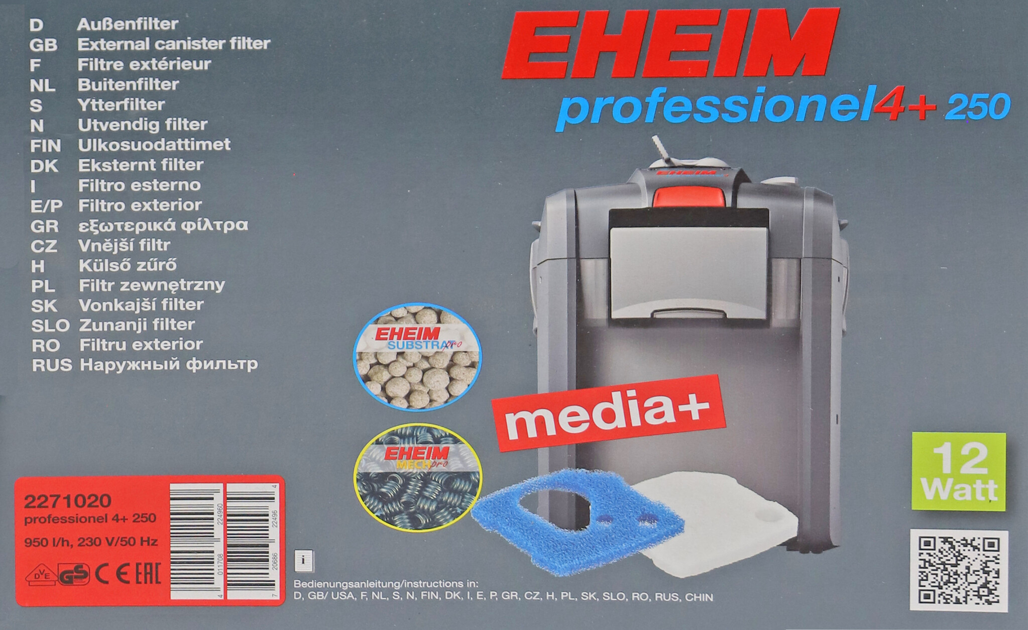 EHEIM Professional 4+ 250 Aquaria tot ca. 120-250 liter. Pompcapaciteit 950 l/h. Stroomverbruik 12 Watt. Art. nr. 2271020.