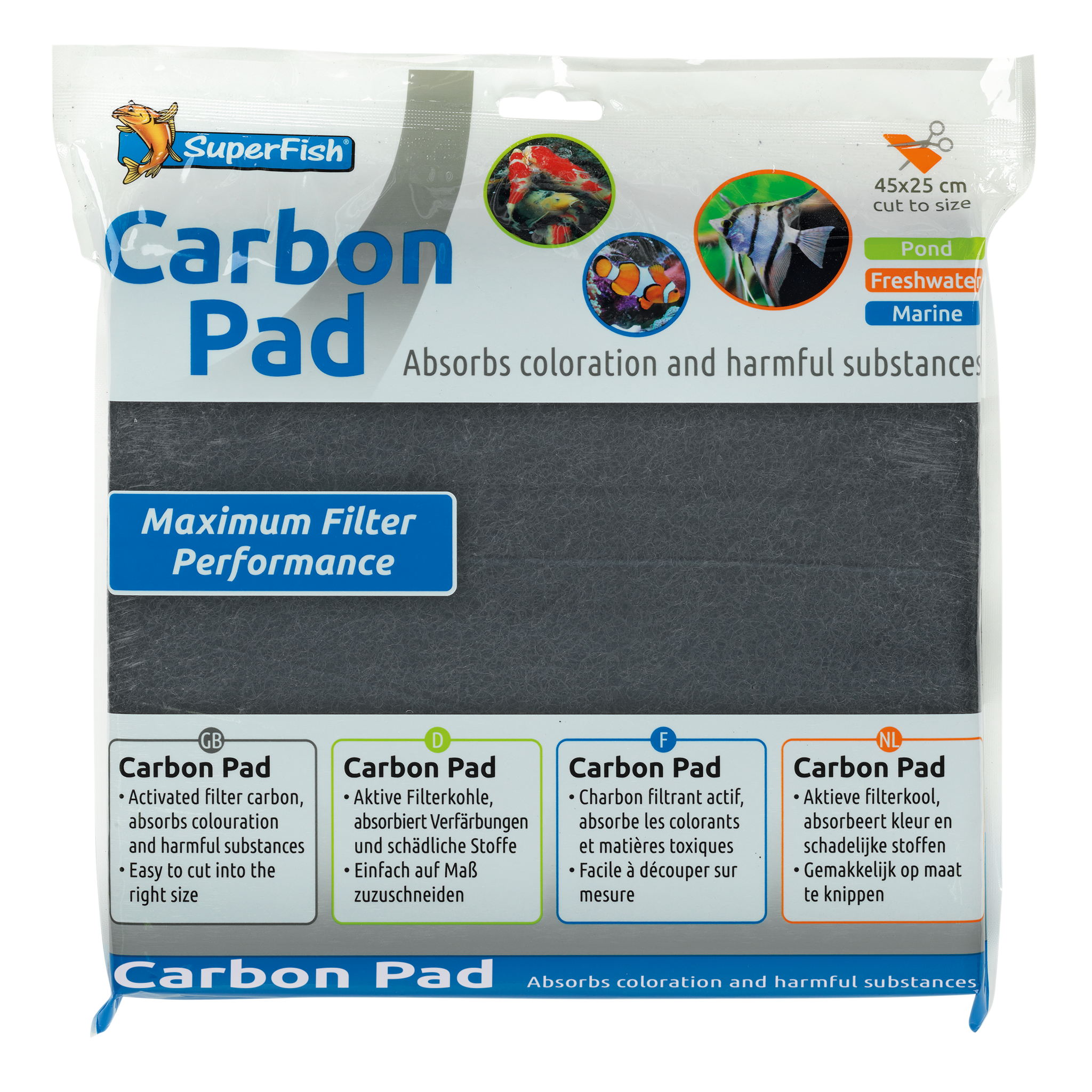 - Geimpregneerd met Actieve Kool, absorbeert in korte tijd kleur- en giftige stoffen uit het water terwijl de pH-waarde neutraal blijft.
