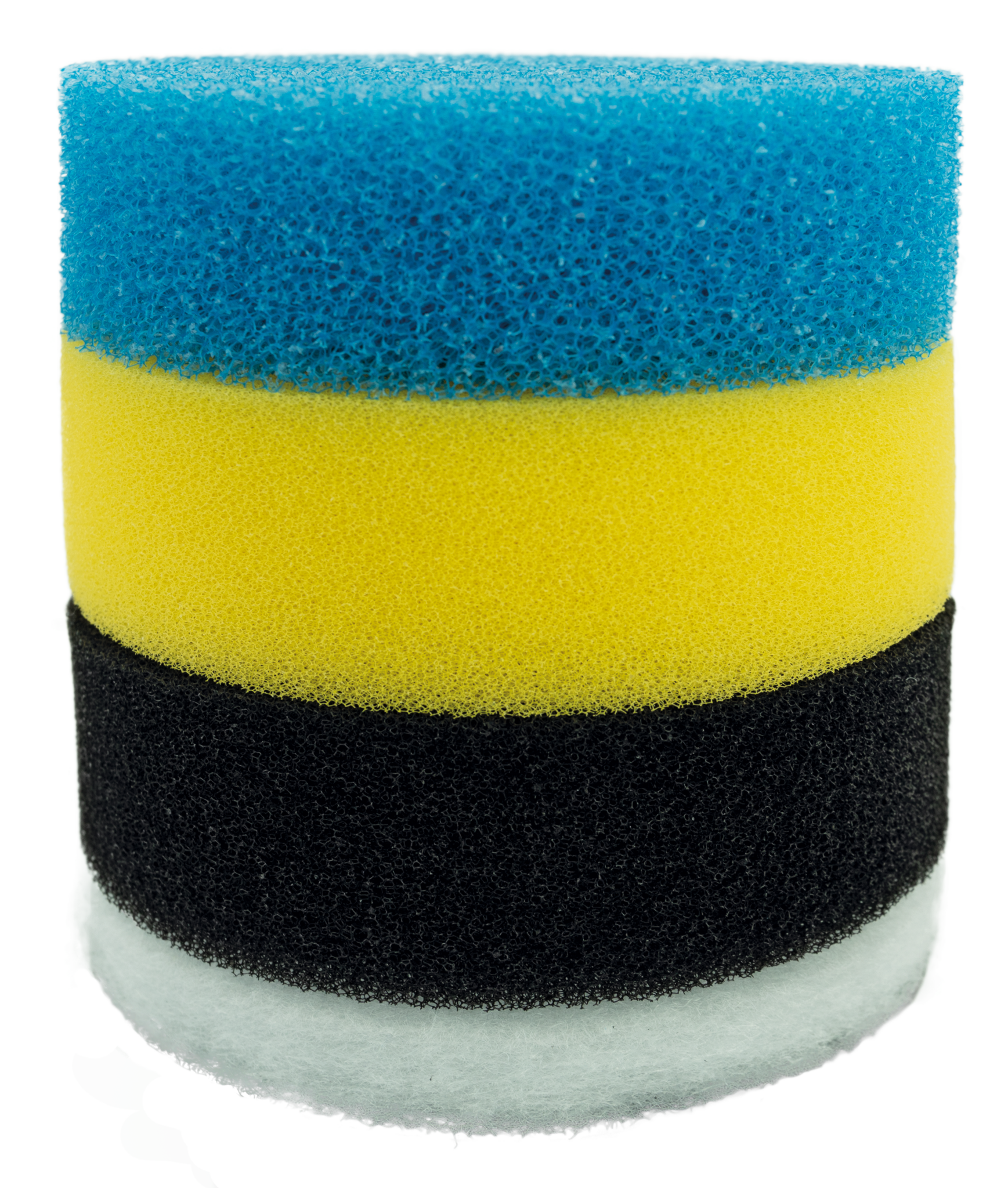 - Ecoflow 240 vervangset, bevat 3 verschillende sponzen (blauw/grof, geel/medium, zwart/fijn) en witte filterwatten.