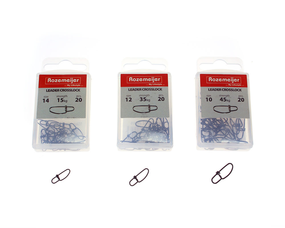 Topkwaliteit leader crosslocks. Verkrijgbaar in de treksterktes 15, 35 en 45 kg. Speel op safe, en neem ze van Rozemeijer. Ze stellen niemand teleur! 20 stuks in een handig opbergdoosje.