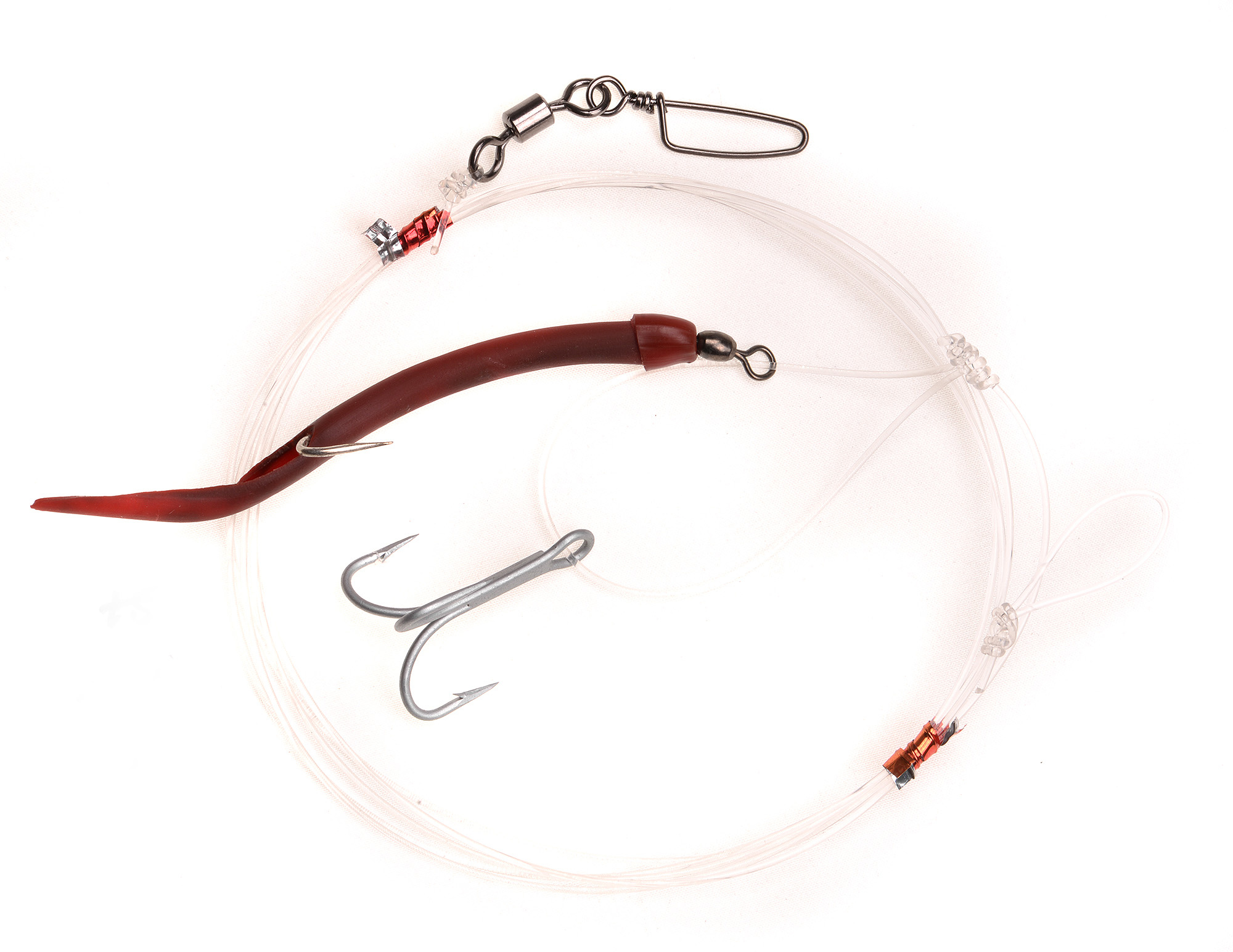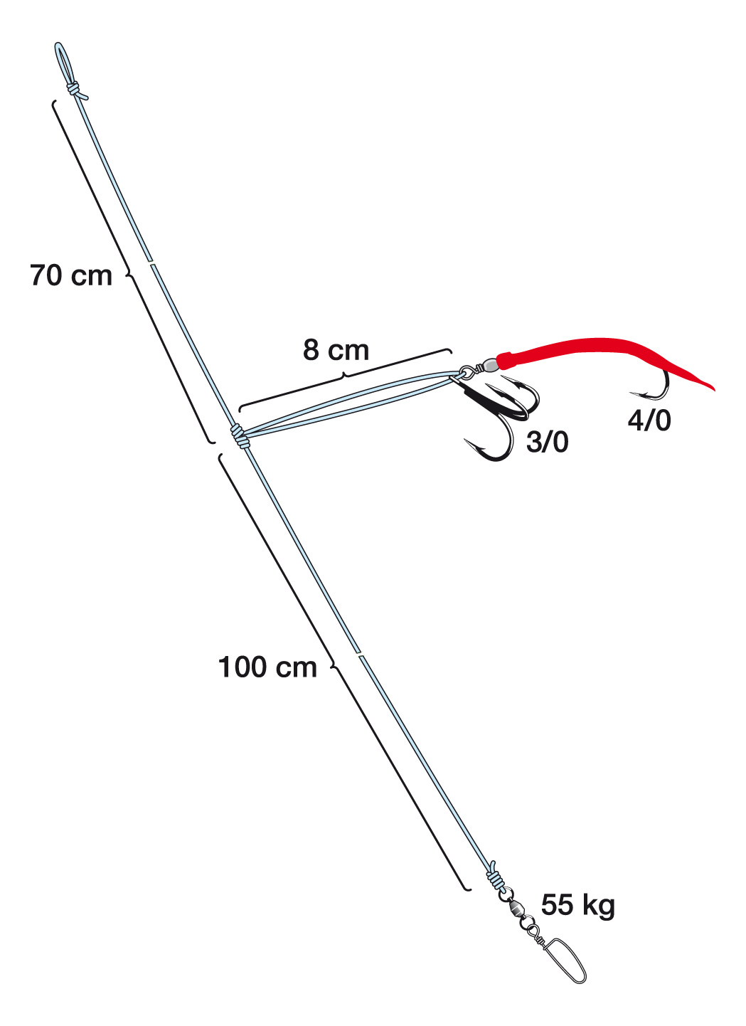 Deze onderlijn is ontworpen voor het vangen van grote kabeljauw. Zij wachten onder een school prooivis, jagen ze van onderaf op en vallen aan. Laat de onderlijn daarom door een school kleine prooivis zakken en