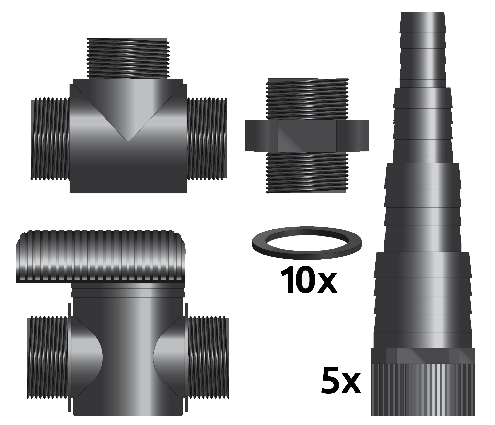 Complete set voor het aansluiten, verlengen, splitsen van vijverslang, universeel toepasbaar en breed inzetbaar.