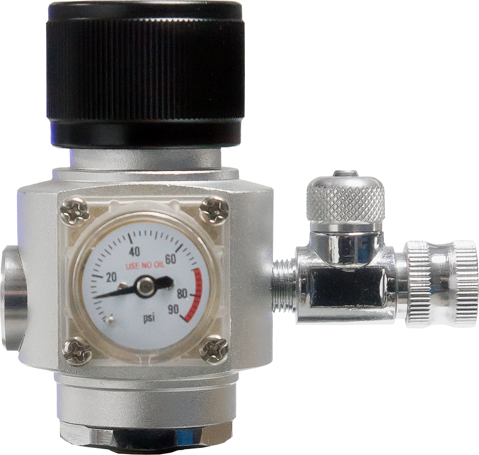 Drukregelaar voor M10x1 aansluiting. Met dubbele kamer, aparte fijnregeling, een open en dicht kraan en een mano meter.