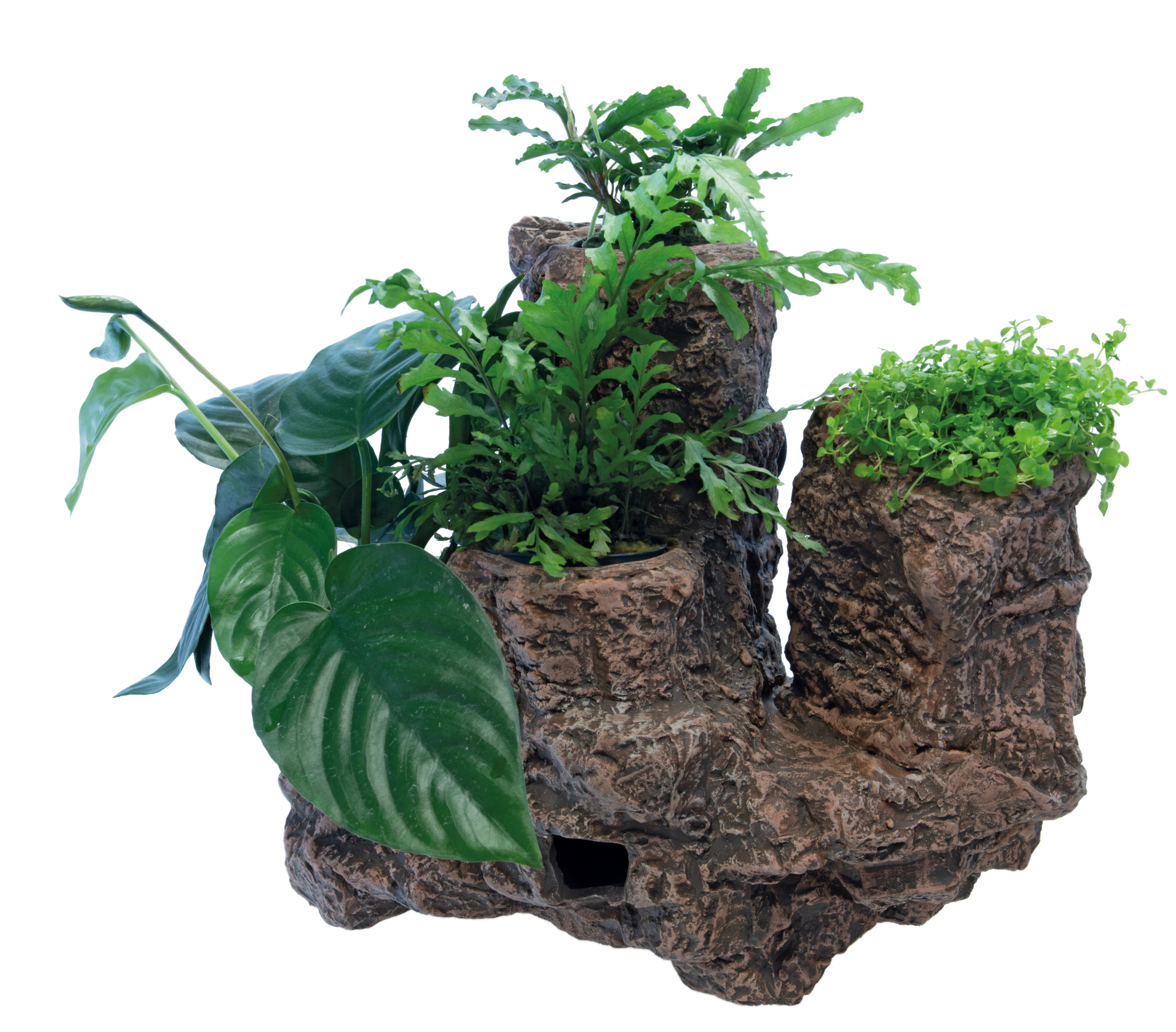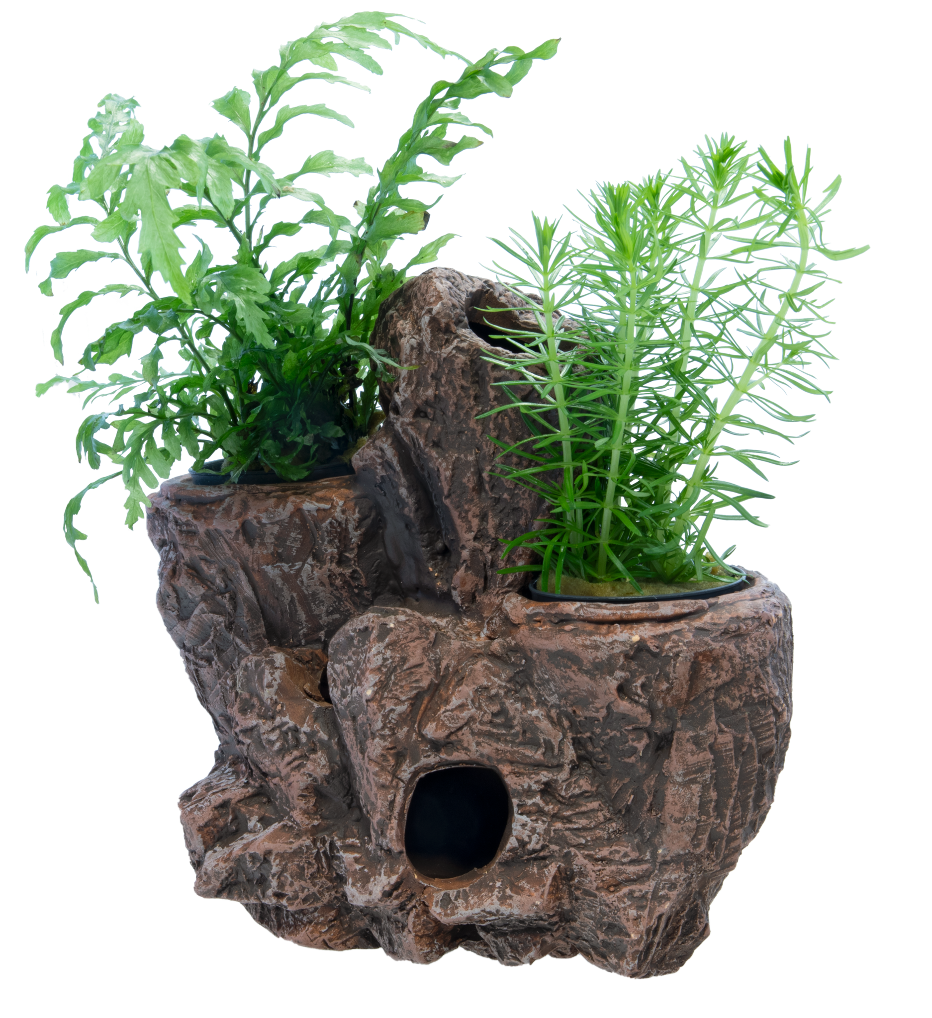 Unieke natuurgetrouwe kopie van rotsen met ruimte voor 2 potplanten in de medium en 4 potplanten in de large (ø 5cm) zodat u deze rots gemakkelijk beplant! Eenvoudige installatie met zuigers aan de wand van het aquarium voor een zwevend effect.