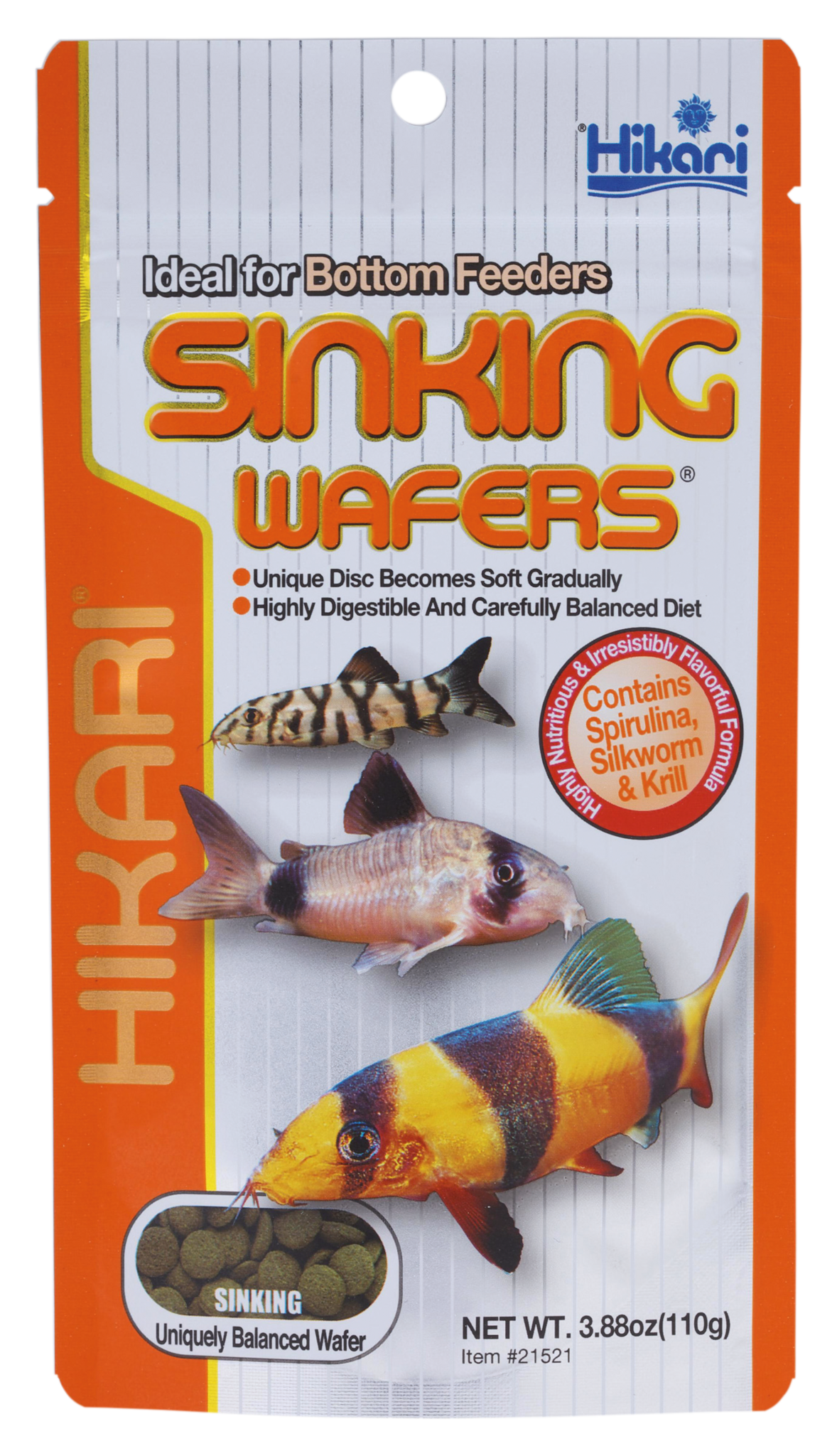 Hikari Sinking Wafers zijn smakelijke aromatische schijfjes, zacht en klein in diameter en ideaal voor kleinere bodemvissen zoals Corydoras, Botia en modderkruipers. Sinking Wafers zijn makkelijk te eten en goed verteerbaar, en ondersteunen het immuunsysteem.