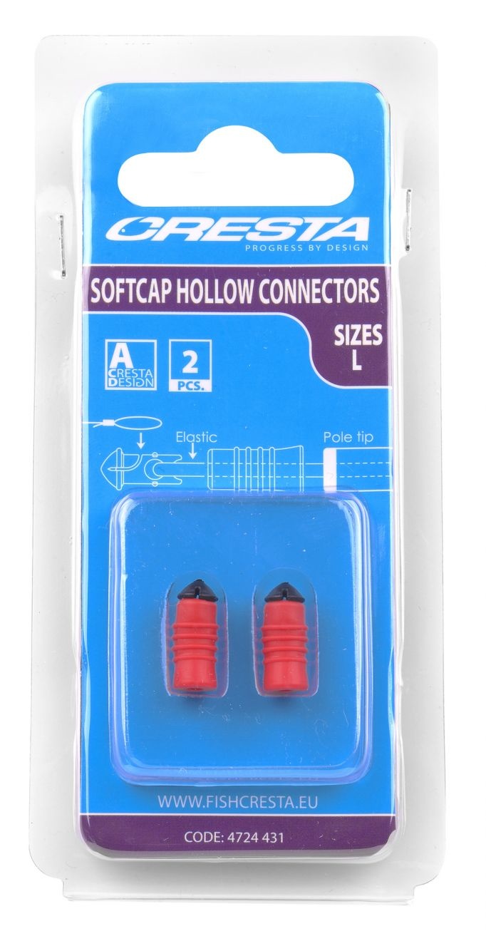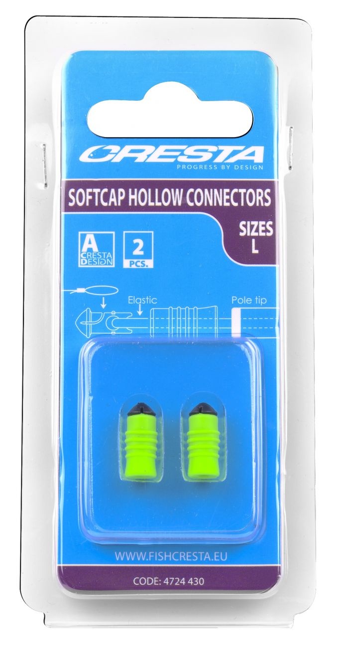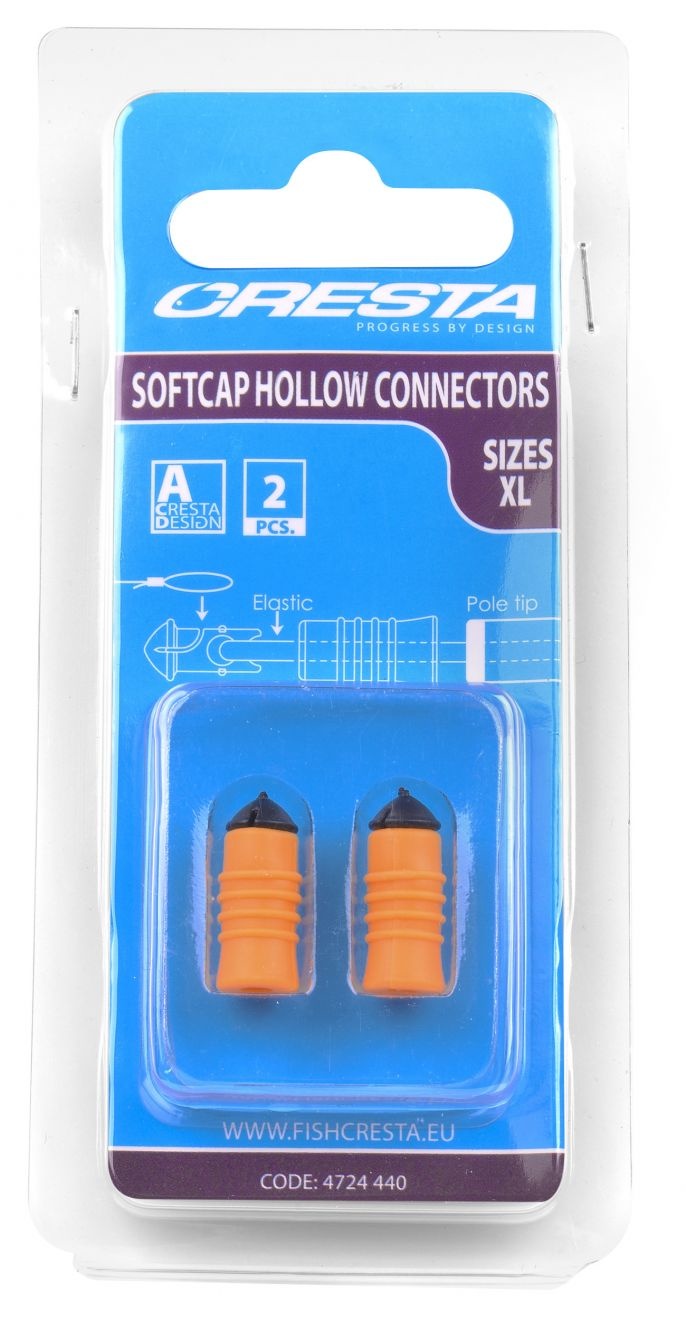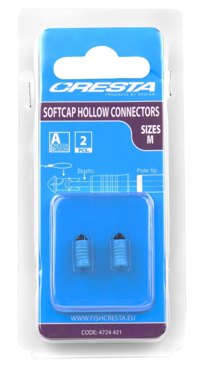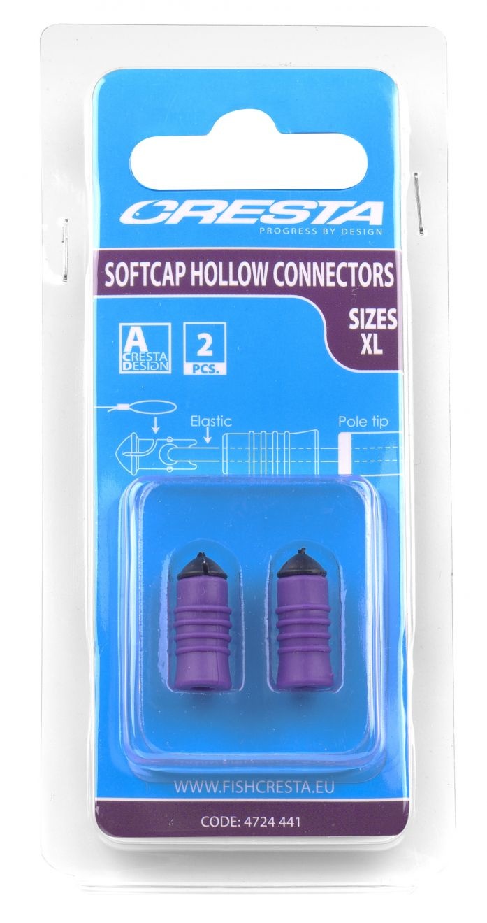 De Softcap Hollow Connectors vormen een compacte en betrouwbare verbinding tussen hoofdlijn en elastiek. Het harde insert gedeelte bezit aan de voorzijde een inkeping ter bevestiging van de hoofdlijn. De achterkant is voorzien van een ronde opening om het elastiek aan te monteren. De zachte cap is vormgegeven met voldoende ruimte voor de knoop en is voorzien van diverse ribbels voor grip. Door de cap over de inkeping tegen de kop van de insert te schuiven, wordt de connector eenvoudig gesloten. De rubberen cap reduceert het geluid bij het raken van de hengeltop en sluit dankzij de tapse vorm hier mooi op aan.