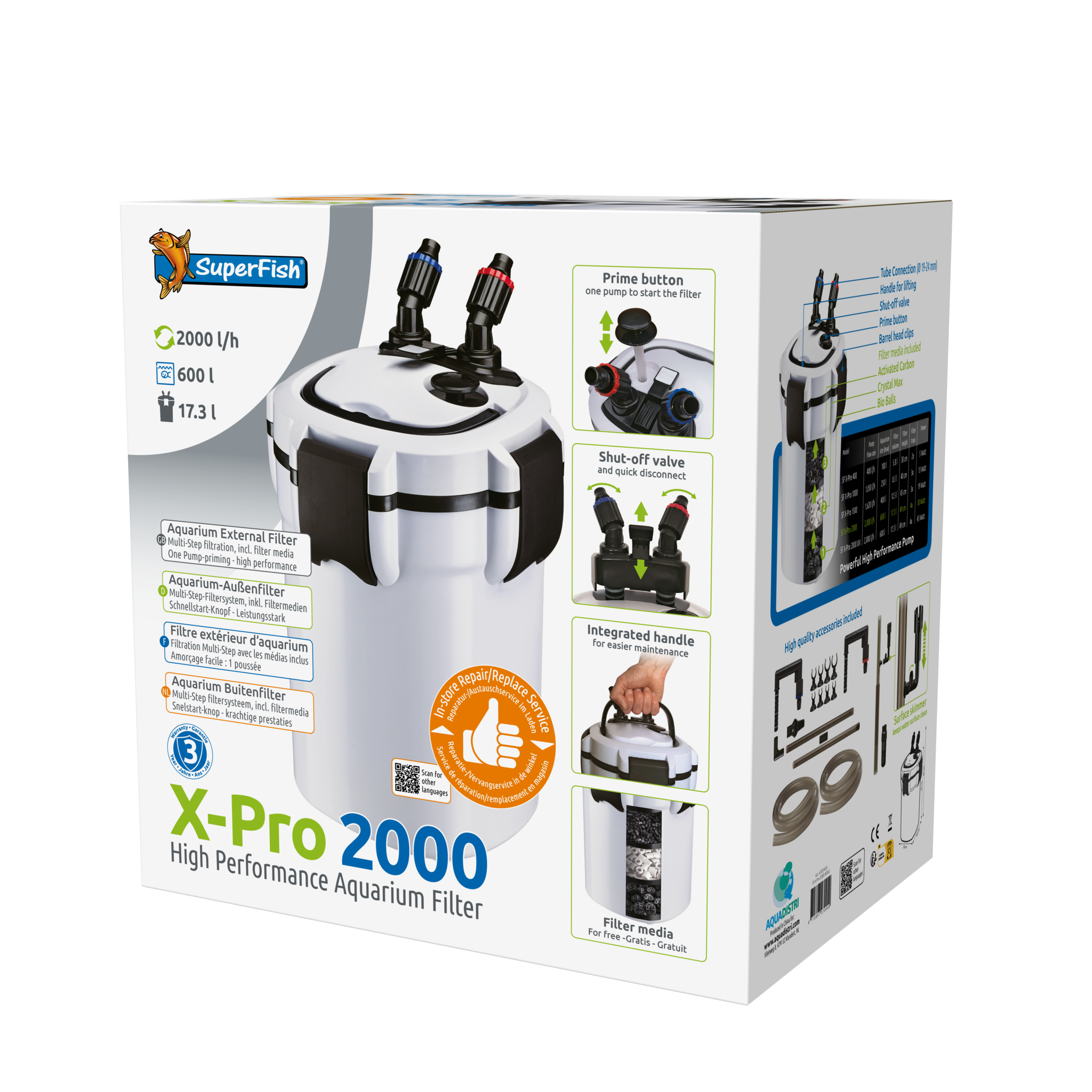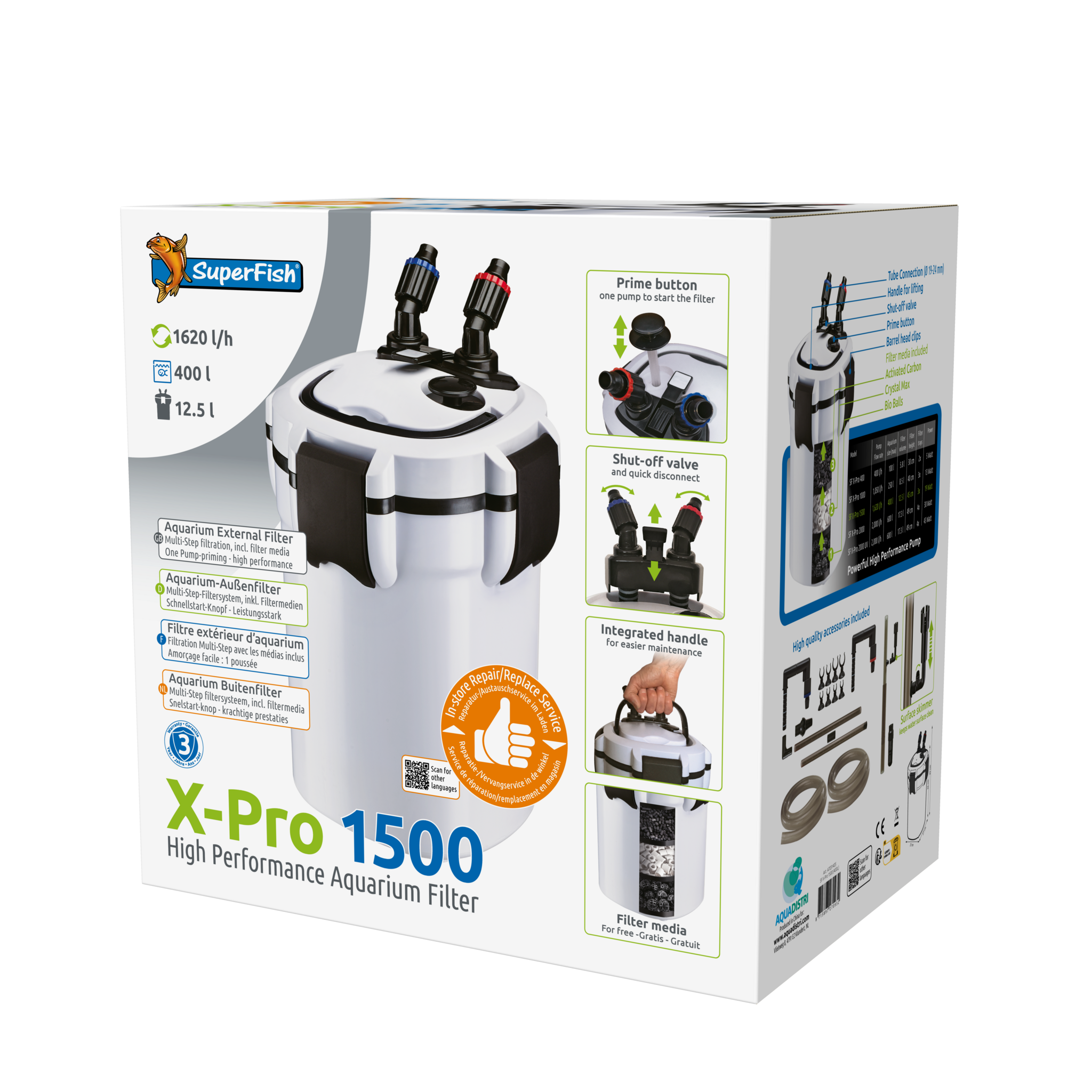De SuperFish X Pro zijn krachtige buitenfilters met een grote biologische filtercapaciteit en unieke 24uurs service gedurende de garantieperiode van 3 jaar. Het filter word compleet geleverd inclusief filtermedia, slangen, buizen, aansluitmaterialen én oppervlakte afzuiger (skimmer). De X Pro is gebruiksvriendelijke door de handige, Snelstart-knop; één keer pompen start het filter, de all-in-one afsluiter met roteerbare slangaansluiting en handgreep voor eenvoudiger onderhoud. De filterslangen zijn 360 graden draaibaar wat de plaatsing van de filter vergemakkelijkt.